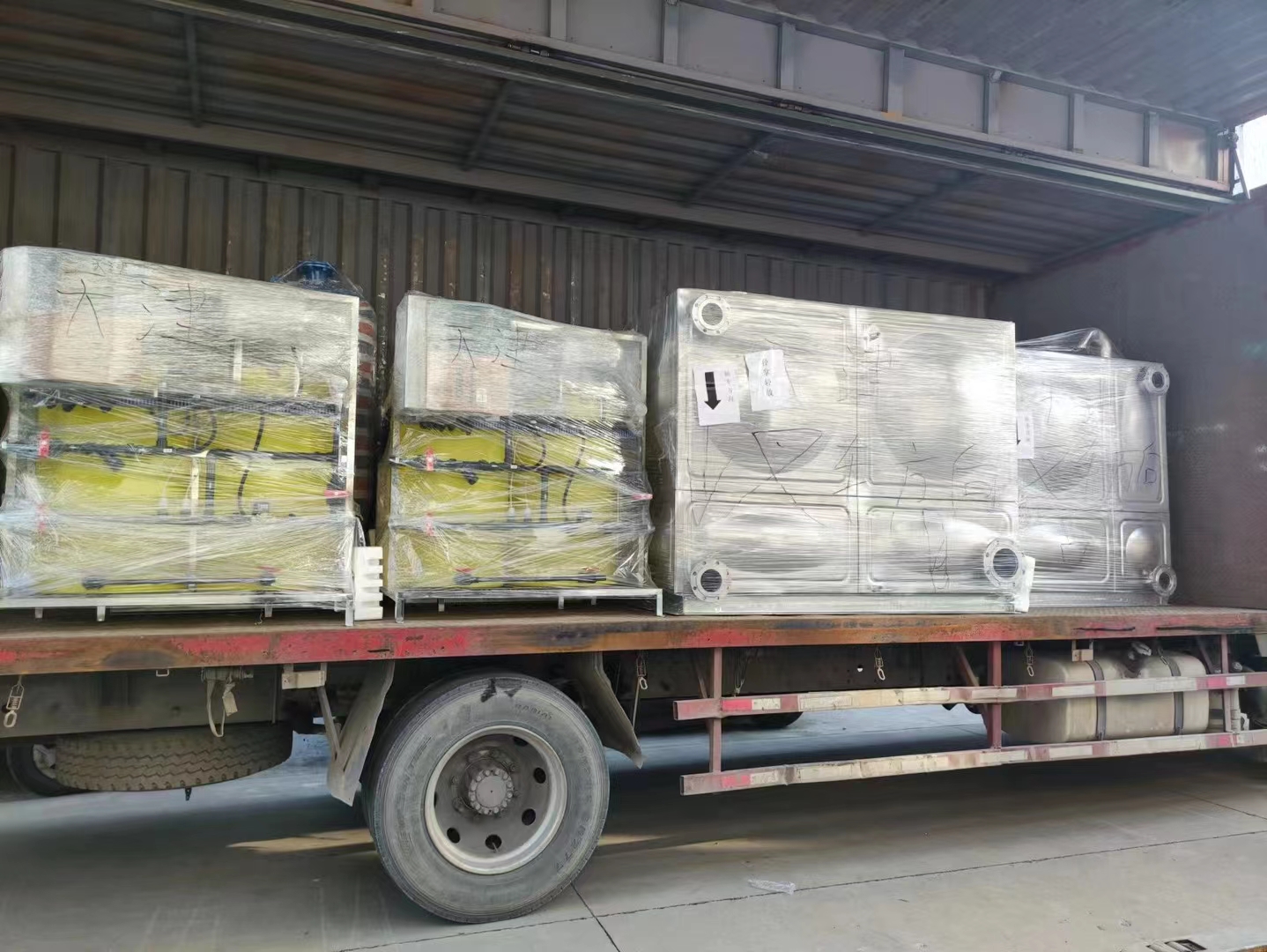天津项目、枣庄项目、宁波项目:一批不锈钢水箱和板换及变频供水设备装车发货完成,上海奥栋承诺必达!